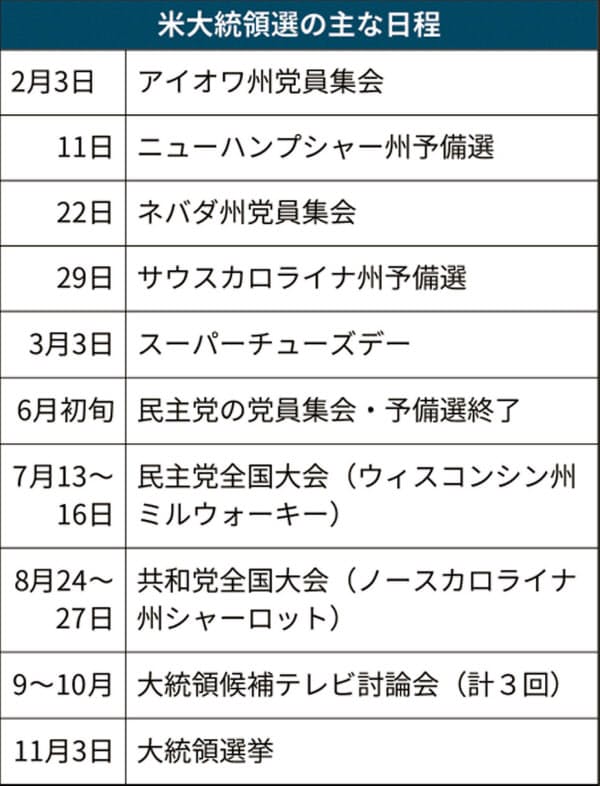 次戦ニューハンプシャーではサンダース氏が優位に立つが、バイデン氏は2月末の南部サウスカロライナ州予備選で戦いを有利に進める。黒人票が多い地域で、黒人のオバマ前大統領を支えた実績が評価されているためだ。党を二分する穏健派、左派の双方で主導権争いは激しさを増している。「打倒トランプ」を目指す選挙戦は本命不在のまま長期化する可能性が出てきた。