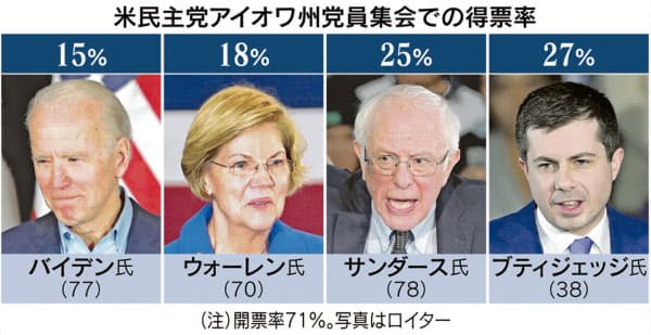 【ワシントン=永沢毅】11月の米大統領選に向けた野党・民主党の候補者選びの初戦、中西部アイオワ州党員集会は穏健派の前インディアナ州サウスベンド市長、ピート・ブティジェッジ氏(38)が途中段階の集計で首位に立った。僅差で左派のバーニー・サンダース上院議員(78)が追う構図だ。穏健派のジョー・バイデン前副大統領(77)は4位と苦戦し、本命不在の混戦を予見する波乱の幕開けとなった。