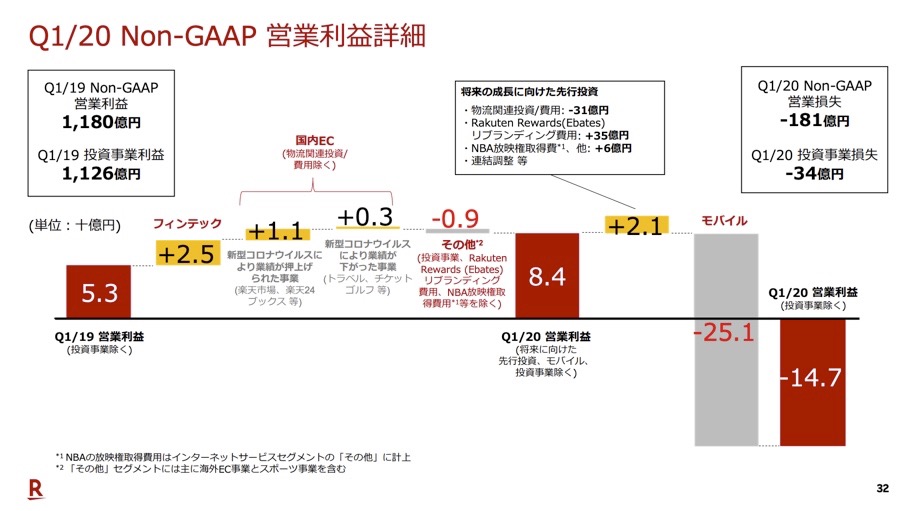 なお、モバイル事業全体では、基地局建設などの先行投資により、費用が前年同期比で251億円増加。楽天の営業利益を大きく押し下げています。