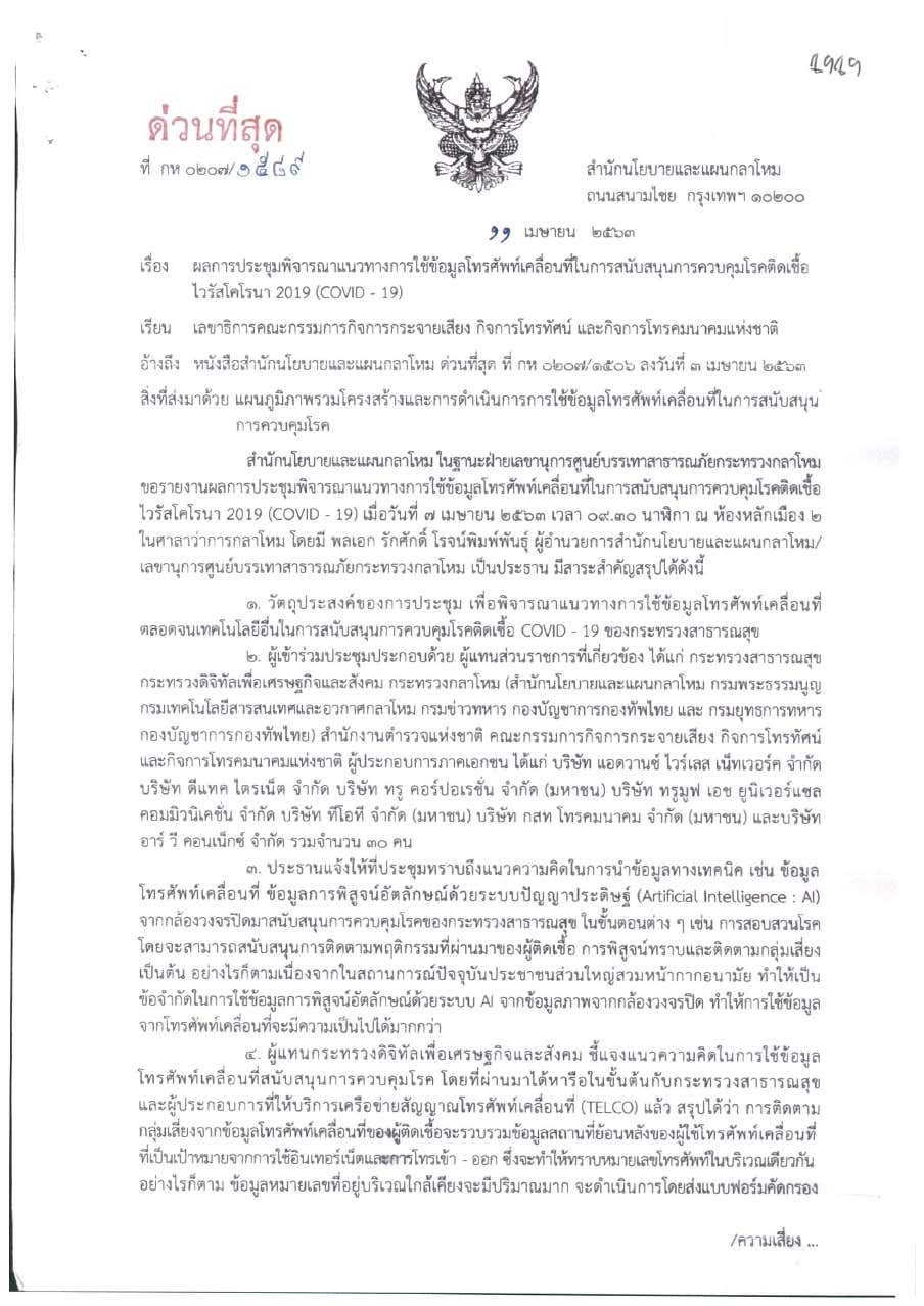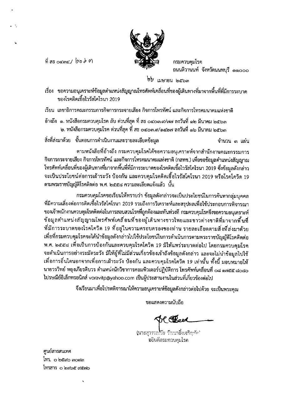 มีคนส่งเอกสารชุดนี้มาให้ค่ะ เป็นหนังสือจากกระทรวงกลาโหม ถึง กสทช. และ หนังสือจากกรมควบคุมโรคถึง กสทช. ขอให้ผู้ให้บริการโทรศัพท์มือถือ ส่งข้อมูลตำแหน่งสัญญาณโทรศัพท์ เคลื่อนที่ย้อนหลัง 14 วัน ของผู้ติดเชื้อรายใหม่ รวมถึงข้อมูลเบอร์โทรศัพท์ของทุกคนที่เคยอยู่ในบริเวณเดียวกันกับผู้ติดเชื้อ เพื่อส่ง SMS แจ้งเตือน และเพื่อดำเนินการสอบสวนโรค ทั้งหมดนี้อ้างอำนาจตาม พ.ร.บ. ควบคุมโรค ประกอบ พ.ร.ก. ฉุกเฉิน
